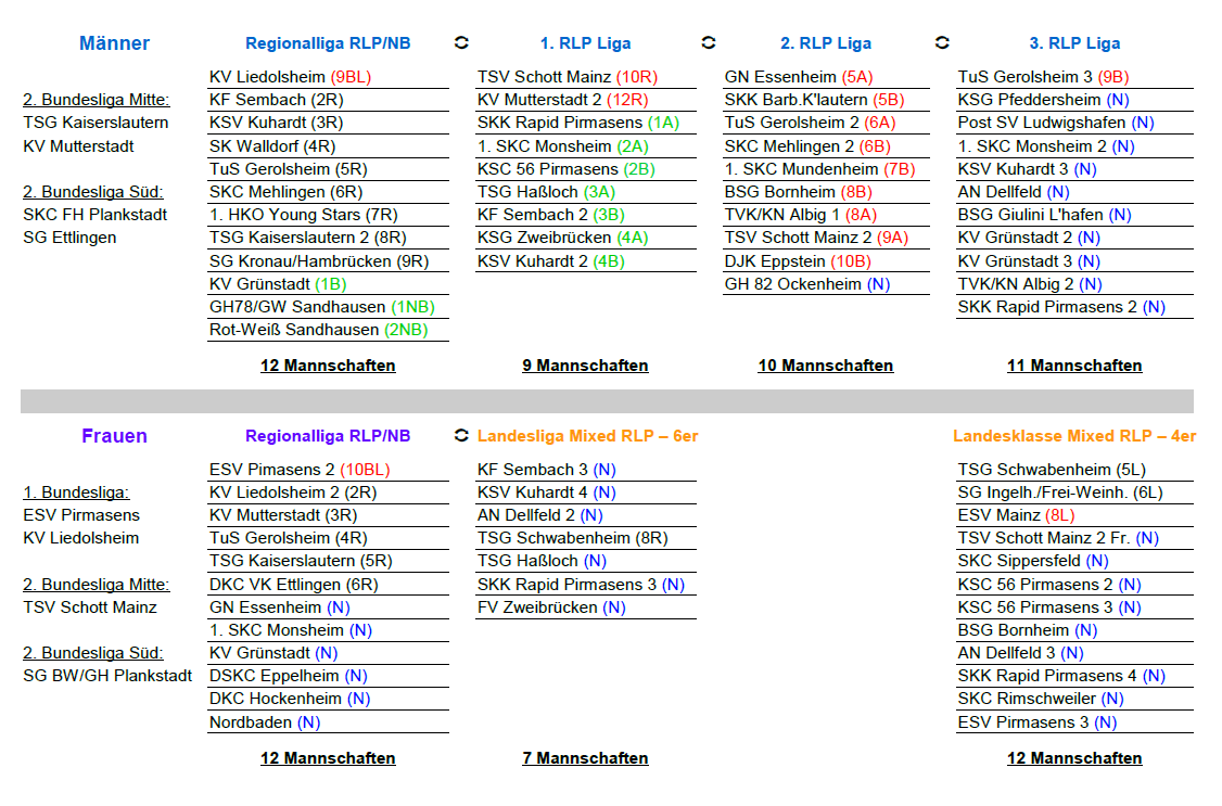 Die 1. Mannschaft der Männer und die 2. Mannschaft der Frauen, treten diese Saison in den Regionalligen Rheinland-Pfalz/Nordbaden an.